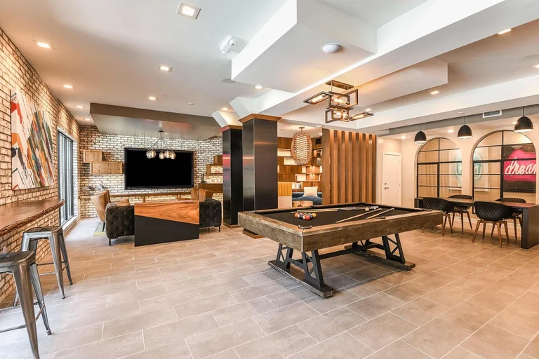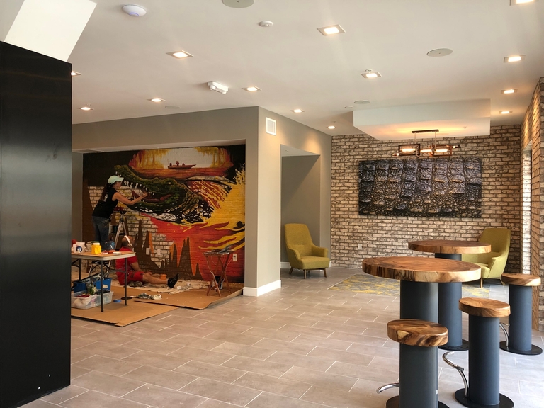 This Student Housing project was located outside of the University of Florida. The client did not want it to scream orange and blue, so we used warm neutrals in the clubroom. We repurposed arched windows as the storefront which delivered southern charm along the with the brick veneer. We worked with local artist to create a game room mural that tied it all together. In contrast, the study room delivered a punch of color to keep those students energized.