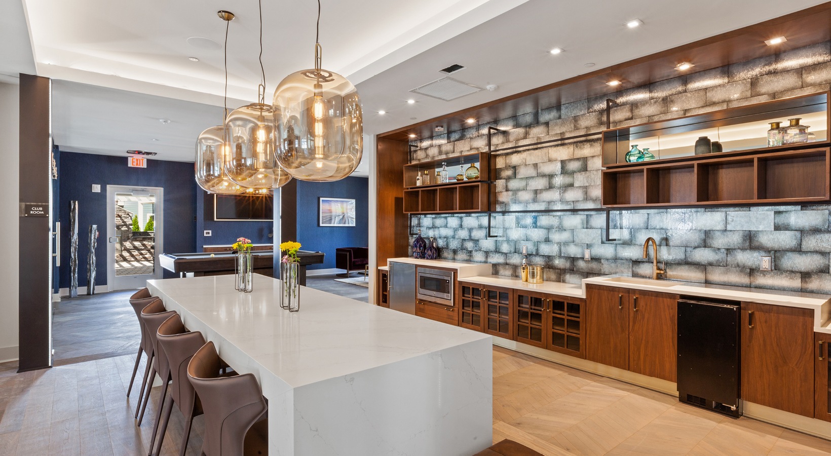 This project was for a small active Senior Living Community. The space was compact but we filled it with amenities that were both beautiful and useful. We wanted to create a high end feel to this clubroom. We used the warmth of the wood and the furnishings to make it feel like an extension of their homes. Accenting that with a unique glass backsplash and beautiful lighting, pushed this space into one worthy for gathering and entertaining.