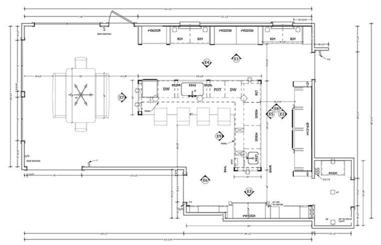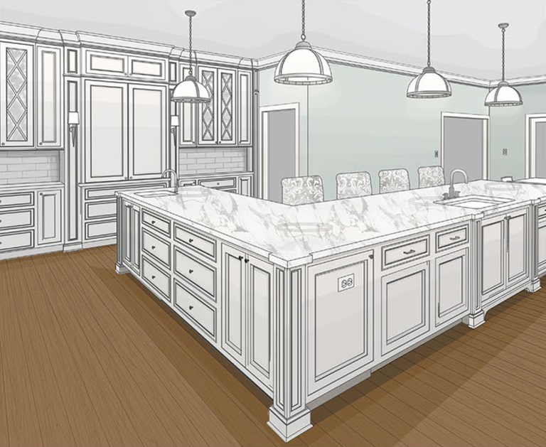A massive island dominates this kitchen design. The client wanted a large island that would not interfere with the many walkways, while we wanted to create a functional kitchen with a tight work triangle. The result was this L-shaped island.