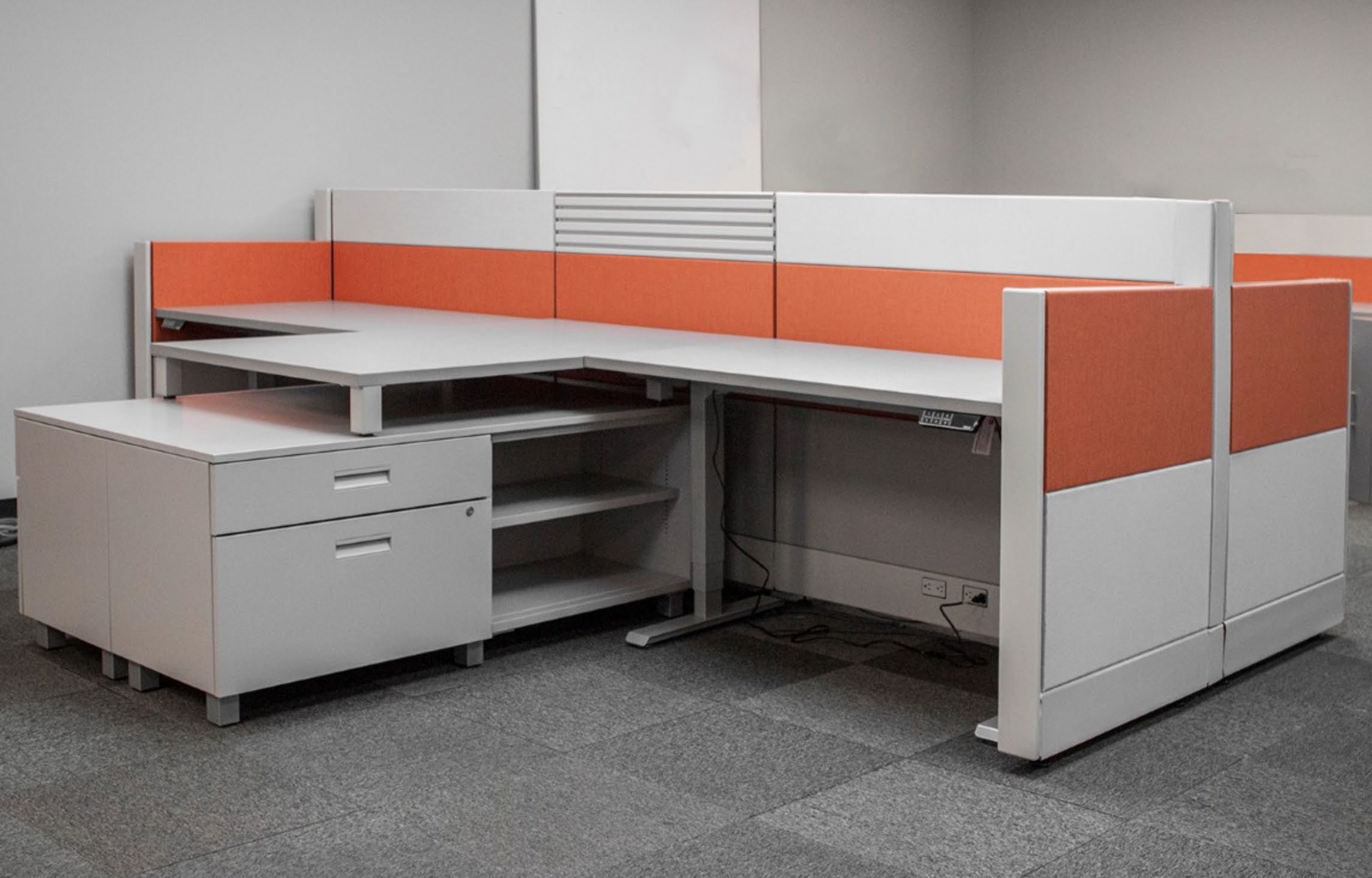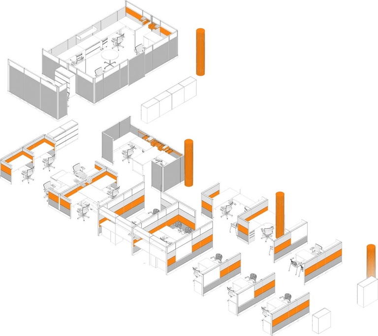This office renovation was comprised of seven departments with varying needs for storage, paper management, and privacy. Sitting down with each department allowed for a personalized working environment while using the same materials to promote the company’s branding. An energetic orange datum runs through the office tying it all together.